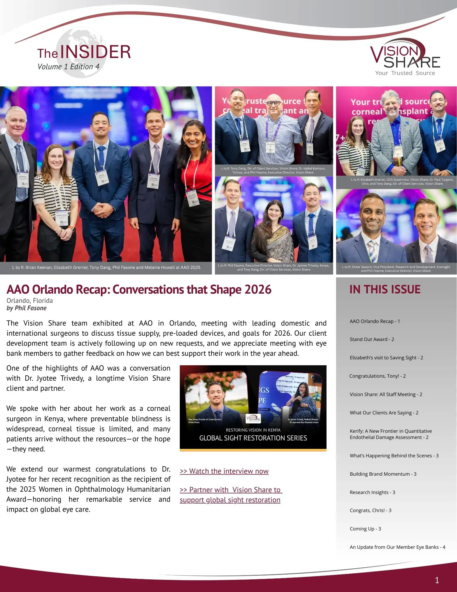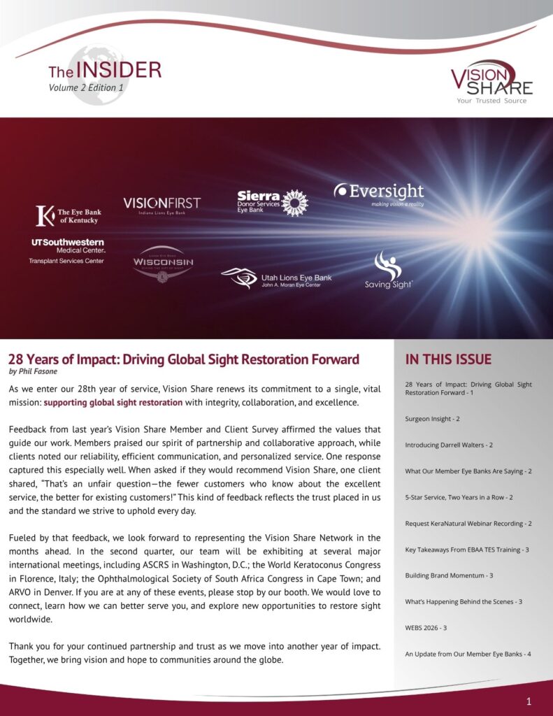 Vision Share a publié son édition du T1 2026 de son bulletin d'information trimestriel, Lisez The INSIDER. Découvrez ce qui se passe à Vision Share et ce que font les membres de notre banque d'yeux.